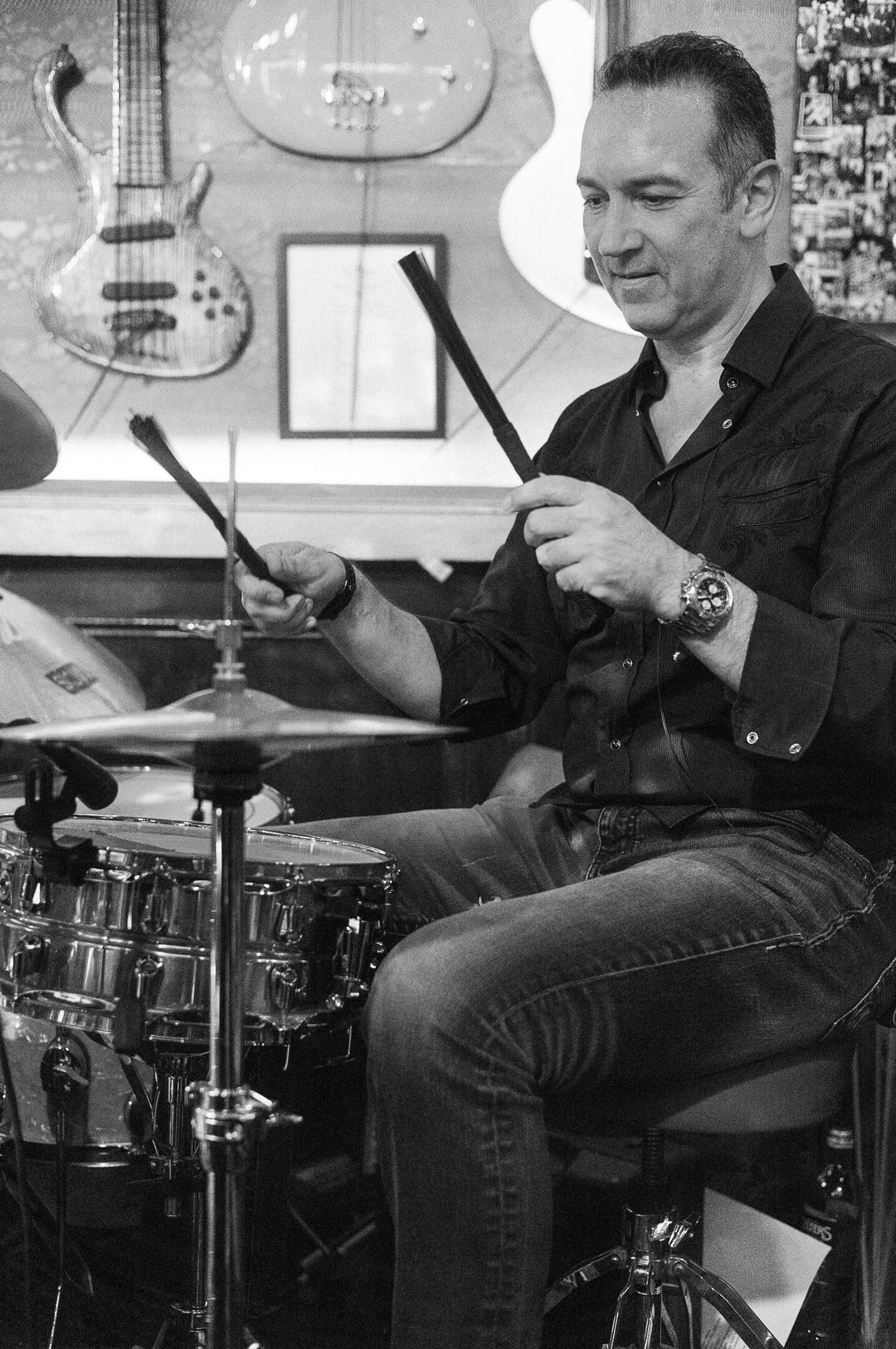 Tony strikes the right note. Sometimes loud, sometimes soft, and sometimes right in your face. That's his job. And he knows what he's doing. With the sticks that mean the world to him, he has already driven Blue Exhibition and Grapefruit Moon, Aristokratz, Rockgewitter, and of course the slow-fi legend De Rienzo.
